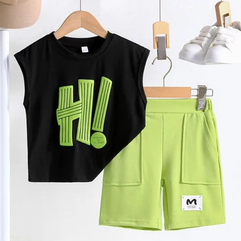 Summer Boys' Sleeveless Letter Printed Sports Top and Casual Shorts Outdoor Sports Two-piece Set